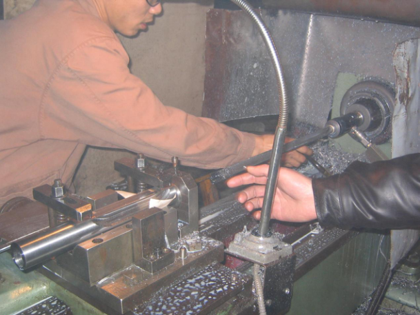 2、根據(jù)實(shí)際情況設(shè)計工裝,將工件固定在機(jī)床中托板上。并可以設(shè)計導(dǎo)向套安裝在工件前端面,引導(dǎo)深孔鉆進(jìn)入。此種方法不需在深孔加工前加工引導(dǎo)孔。大大提高了加工效率。改造深孔鉆鏜床刀具的安裝可根據(jù)工件的實(shí)際情況選擇方式:機(jī)床轉(zhuǎn)速和最小進(jìn)給量都能滿足加工要求時,旋轉(zhuǎn)夾具錐柄直接安裝在機(jī)床主軸錐孔內(nèi),刀具安裝在旋轉(zhuǎn)夾具,機(jī)床主軸通過旋轉(zhuǎn)夾具帶動刀具作旋轉(zhuǎn)運(yùn)動,進(jìn)給運(yùn)動由大托板提供。