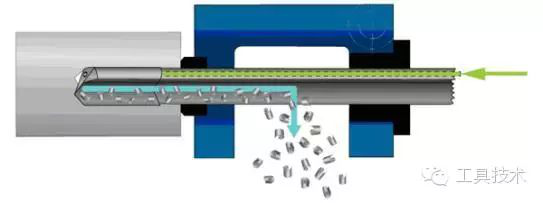 槍鉆(見圖1)的鉆柄是空的,由內(nèi)外部供應(yīng)的切削液流經(jīng)鉆頭內(nèi)輸送管,并強(qiáng)行流經(jīng)切削頭內(nèi)的孔。鉆柄外側(cè)有一個(gè)沿著長度方向的V形槽,切削液攜帶切屑通過此V形槽,并經(jīng)過鉆頭外側(cè),最終切屑從孔中排出。槍鉆可應(yīng)用于普通加工中心,但是需要高壓力的切削液。