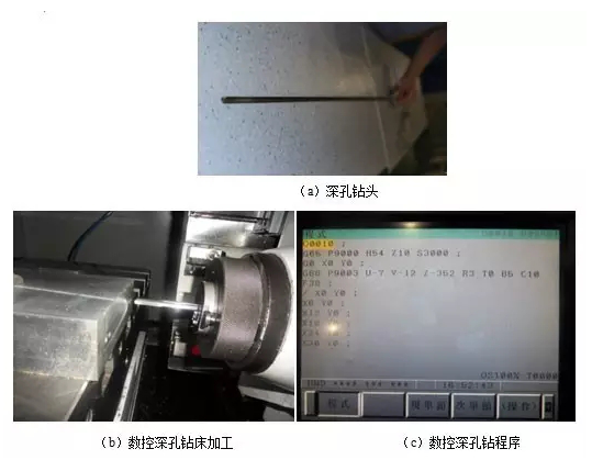 數(shù)控深孔鉆床使用(見圖4),經(jīng)過反復(fù)試驗(yàn),1個(gè)深孔加工動(dòng)作宜采用“三級(jí)加工法”:定位鉆削、導(dǎo)向鉆削及正常鉆削,稱為“三級(jí)鉆孔技術(shù)”。三級(jí)鉆孔需要根據(jù)不同的鉆孔深度采用不同的切削速度,目前機(jī)床自帶的數(shù)控鉆孔指令只能完成1個(gè)鉆孔深度和1個(gè)切削速度,如何使用常用的鉆孔指令來實(shí)現(xiàn)三級(jí)鉆孔可分兩種方法:①手動(dòng)干預(yù):根據(jù)不同的鉆孔深度,人為的手動(dòng)來進(jìn)行調(diào)節(jié)切削速度。②重復(fù)進(jìn)給:對(duì)同一個(gè)孔分別進(jìn)行編制3個(gè)鉆孔程序,指令不同的鉆孔深度和切削速度,進(jìn)行重復(fù)操作。