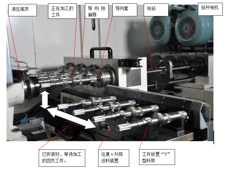 該機(jī)床的工件裝卸由人工實(shí)施。即人工安裝四支工件在預(yù)定位支架上,機(jī)床開始深孔鉆削。加工完成后,機(jī)床停止加工,人工將加工好的四支工件取走,再重新安裝上四支新工件。往復(fù)運(yùn)行。