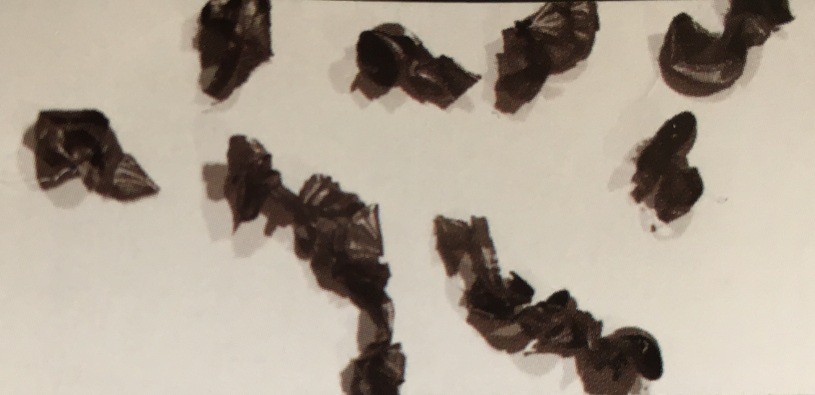 整體焊接式槍鉆加工鐵屑形狀見下圖,長(zhǎng)度均較長(zhǎng),容易堵屑、纏屑。